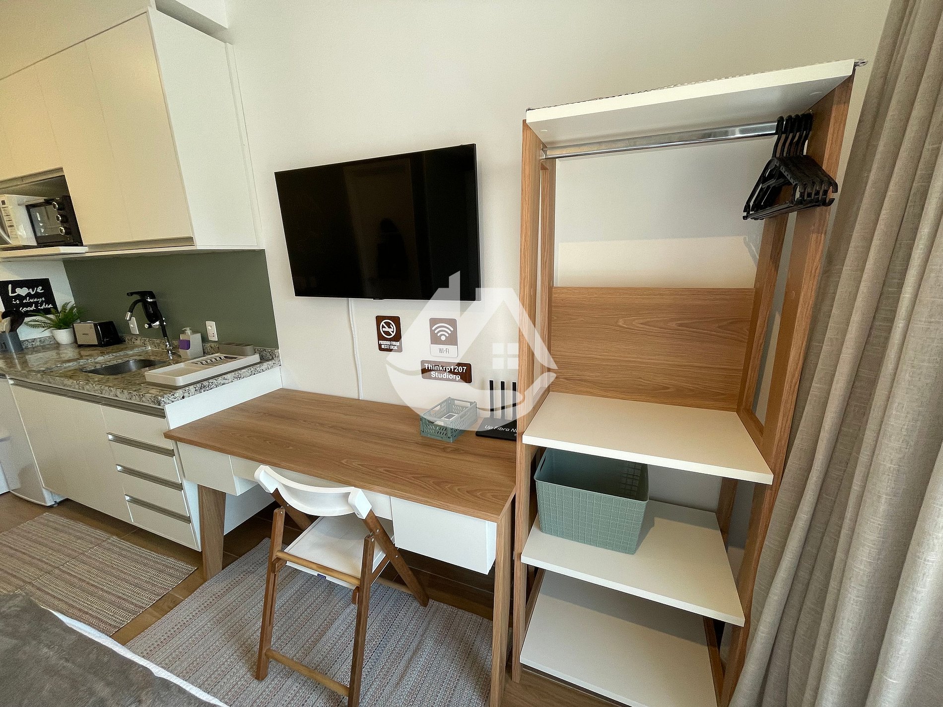 Studio fully furnished, with wardrobe, induction cooktop, shower with hot and cold water, bathroom sink with hot and cold water, water filter for consumption, in addition to all the utensils necessary for your well-being and comfort. The studio is also equipped with a television and excellent quality Wi-Fi.