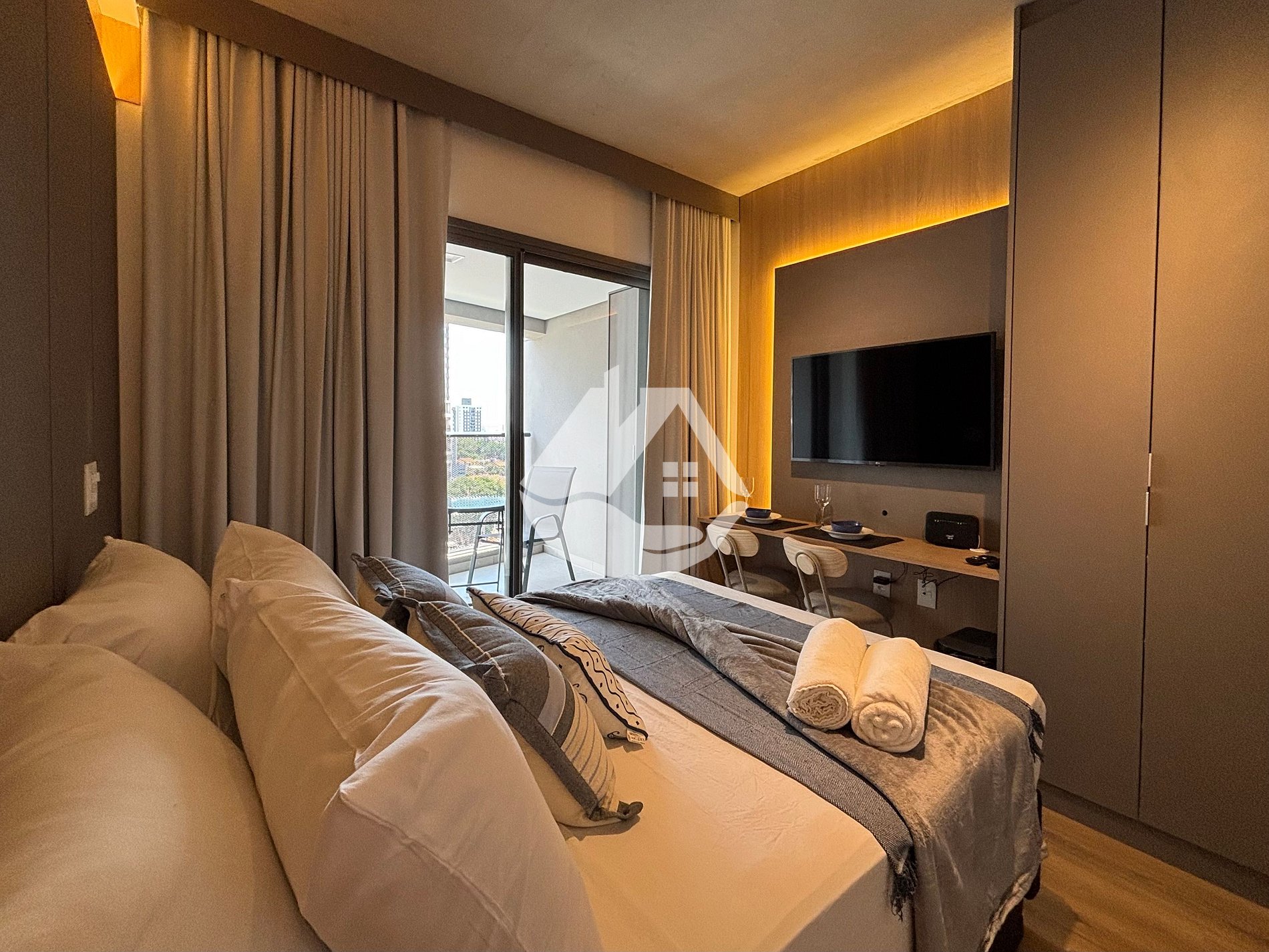 O studio é novo e conta com tudo o que você precisa para uma estádia confortável. Temos ar-condicionado, wifi, cama tamanho casal, ferro de passar roupa, secador de cabelo, cafeteira e café, varanda com assentos confortáveis para tomar um vinho no fim de tarde e mesa com cadeiras que pode ser utilizada tanto para refeições quanto para trabalho!
