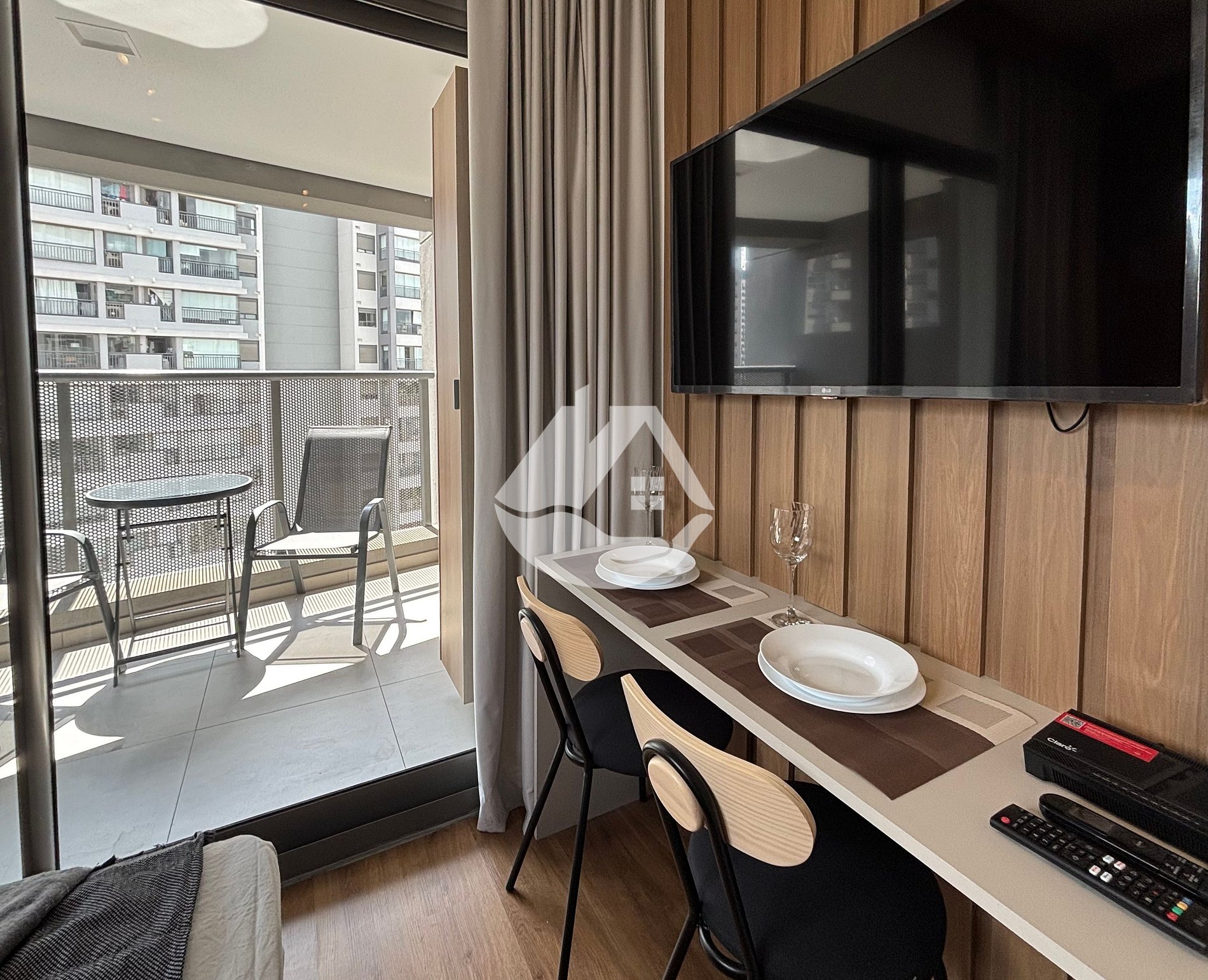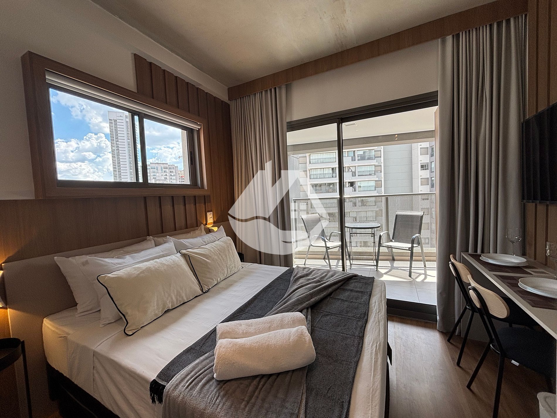 O studio é novo e conta com tudo o que você precisa para uma estádia confortável. Temos ar-condicionado, wifi, cama tamanho casal, ferro de passar roupa, secador de cabelo, cafeteira e café, varanda com assentos confortáveis para tomar um vinho no fim de tarde e mesa com cadeiras que pode ser utilizada tanto para refeições quanto para trabalho!