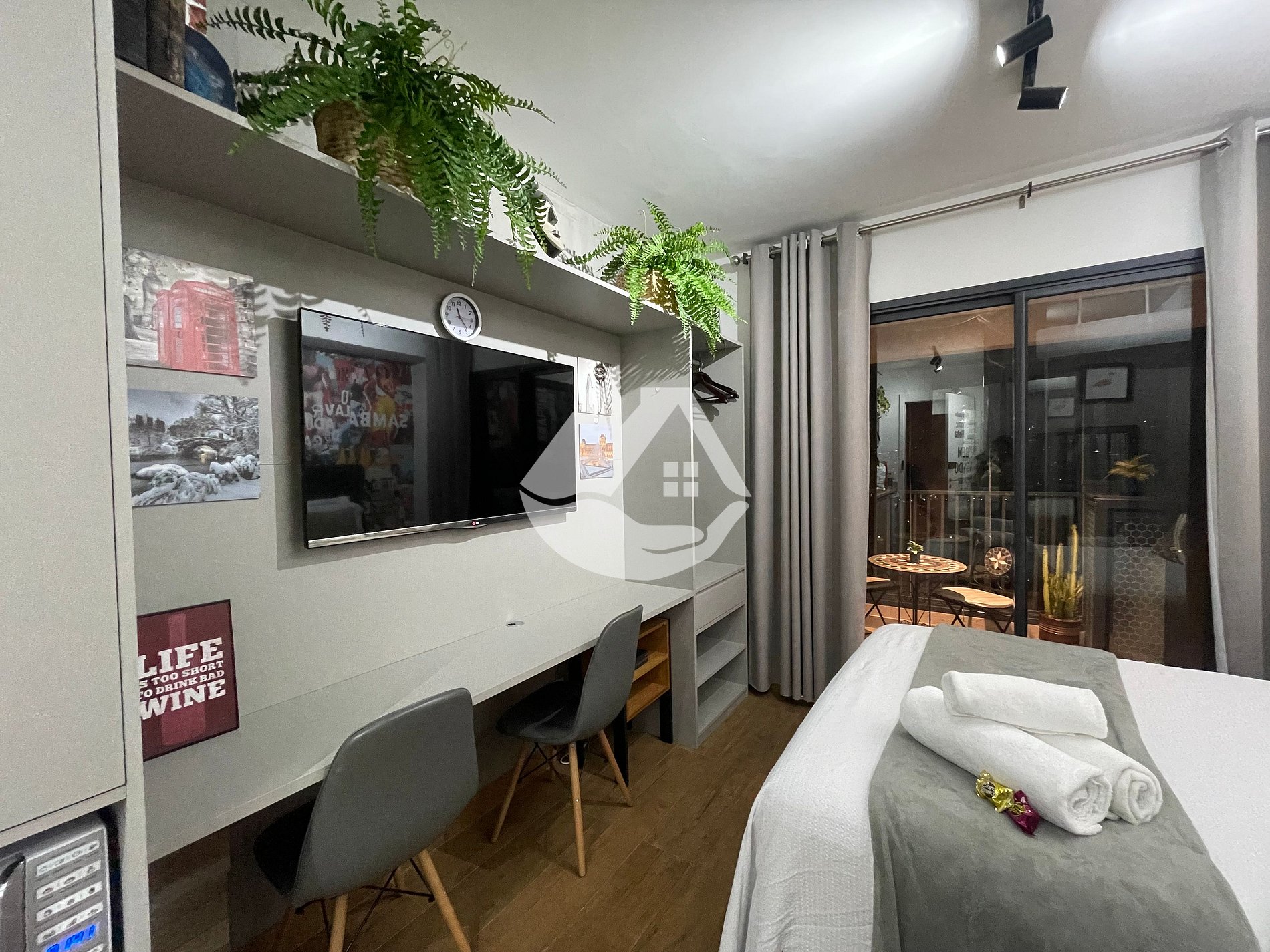 O studio é completo com tudo o que você precisa para tornar sua estadia confortável. Temos roupa da cama e banho, travesseiros, ar-condicionado, cafeteira, airfryer, secador de cabelo, ferro de passar roupa, utensilios de cozinha, cooktop de indução, panelas e muito mais! Além isso, se encontra em andar alto com vista livre, com uma varanda perfeita para tomar um vinho pela noite, ou trabalhar vendo o nascer do dia.