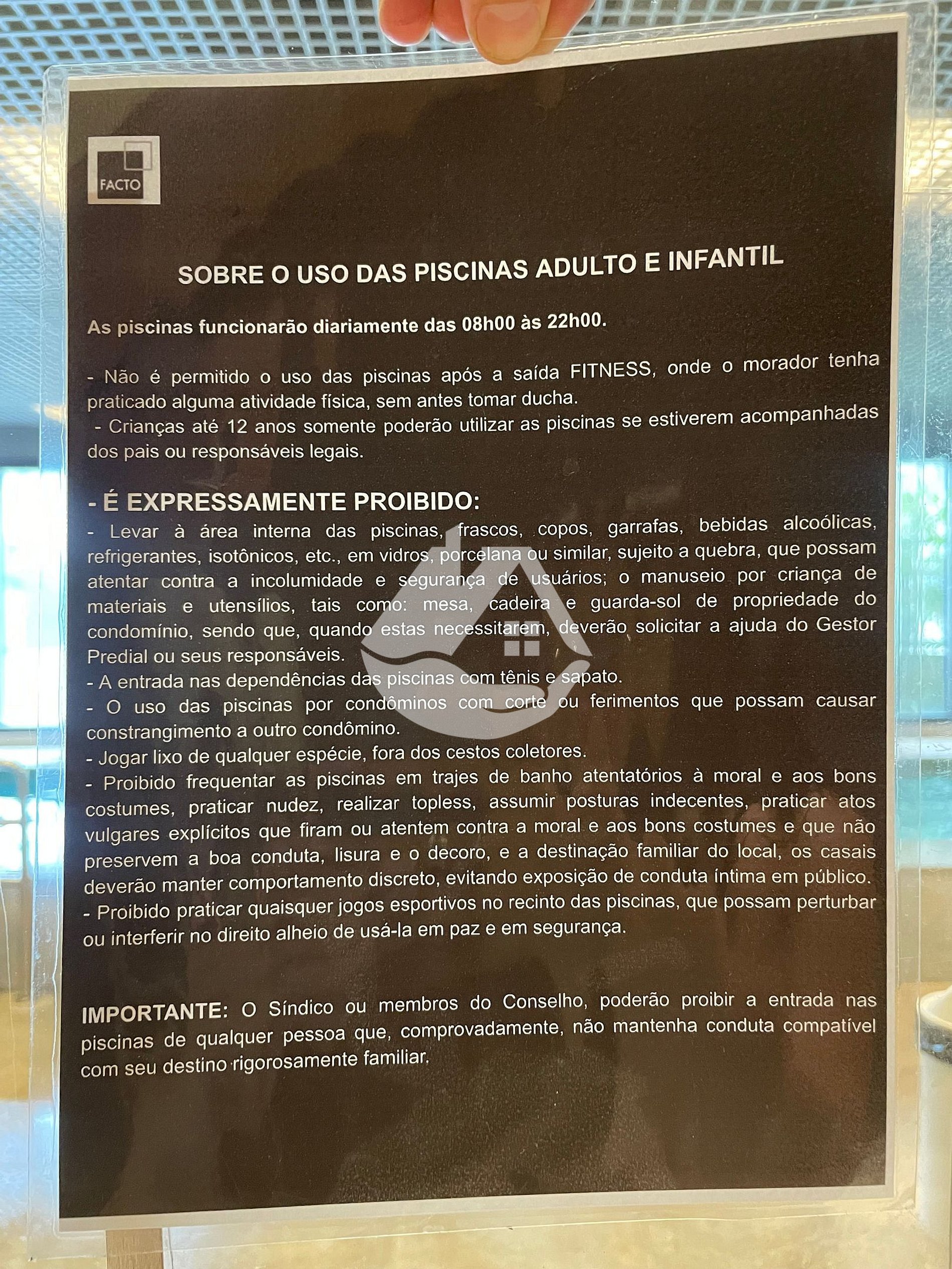 - Proibido utilizar copos e itens de vidro na área da piscina;